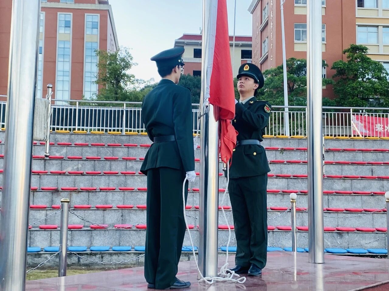 11月14日清晨,升旗仪式正式启幕。五星红旗在熠熠晨光中冉冉升起、迎风飘扬,全体师生一片庄严肃穆。